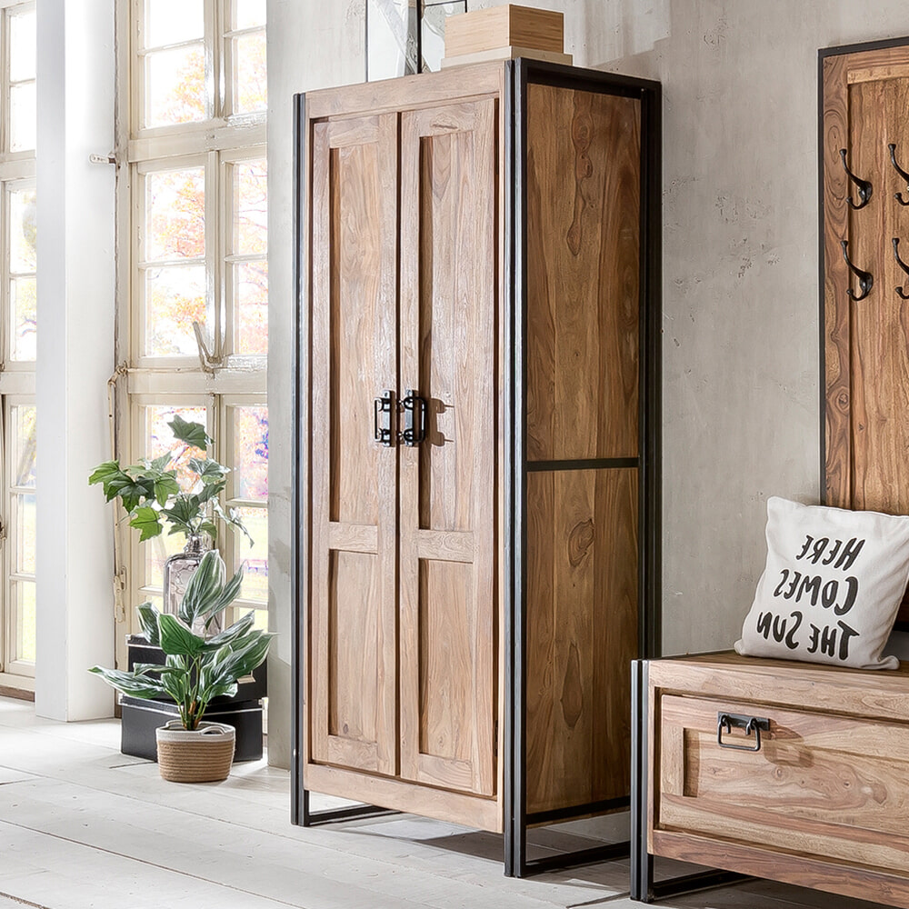 Deze halkast van acaciahout is een aantrekkelijke blikvanger in je woonkamer. Hij scoort met een mix van hout in een warme natuurtint en metalen handgrepen. De materiaalmix van warm hout en stoer metaal is helemaal volgens de trend en zorgt voor interessante contrasten in het uiterlijk. Naast het uiterlijk maakt de kast indruk met zijn tastbare structuur. Hij kan harmonieus worden geïntegreerd in verschillende woonprogramma’s. Achter twee deuren met drie legplanken en een losse kledingroede is er veel gesloten opbergruimte voor diverse alledaagse voorwerpen. Zelfs dossiermappen zouden hier een echt stijlvolle plaats krijgen, als deze kast zijn werk deed als kantoorkast. Zorgt voor een huiselijke sfeer: de halkast met een moderne mix van materialen. Elk stuk is uniek.