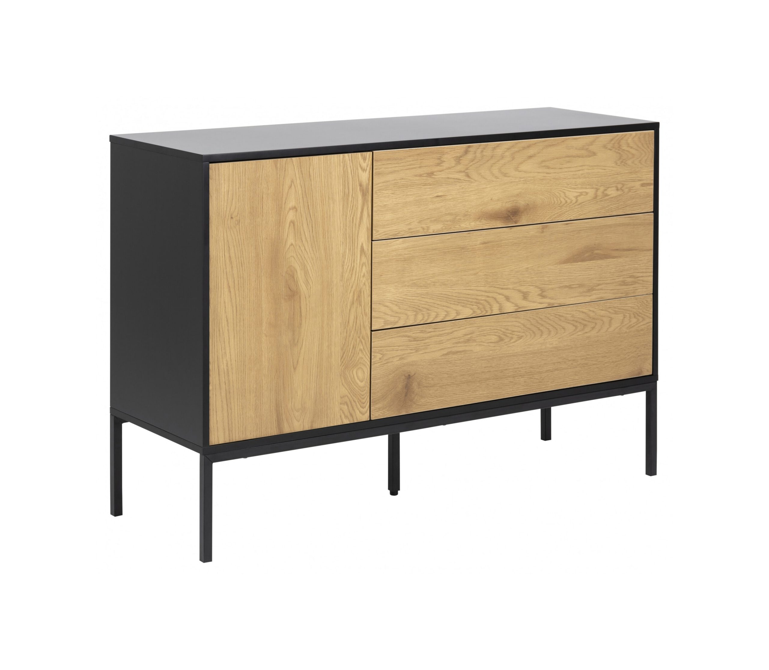 Geïnspireerd door industrieel design heeft dit dressoir een aparte uitstraling. De deur, in een wilde eikenlook, steekt visueel af tegen het matzwarte frame. Zo’n contrast kan verfrissend aanvoelen. Wat betreft de opbergruimte heb je 3 laden, en een plank achter de deur tot je beschikking. Er passen dus nogal wat voorwerpen in. Door zijn uiterlijk is dit ontwerp modern, en het brengt ook warmte in je huis.