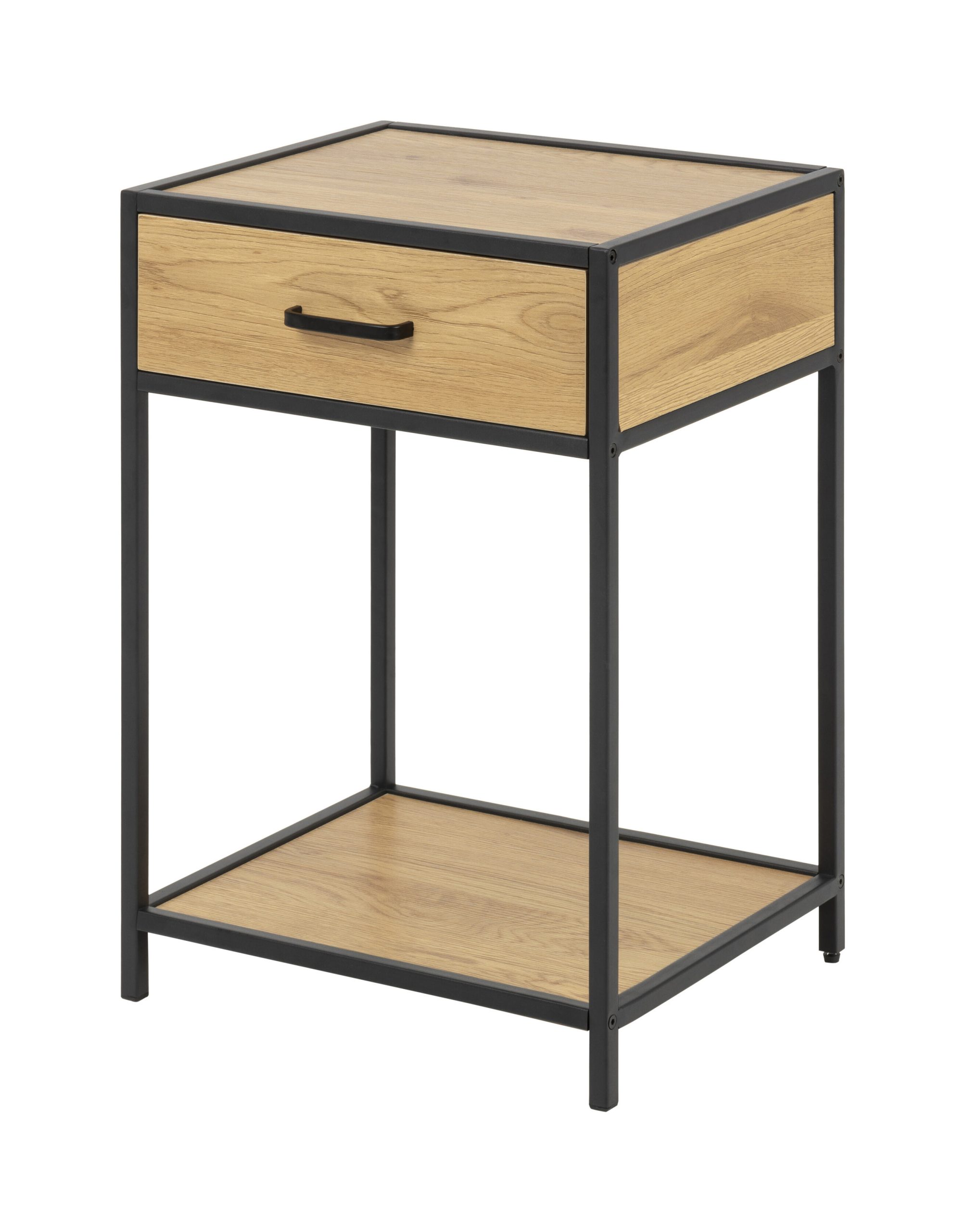 Dit nachtkastje is geïnspireerd op industrieel design en combineert natuurlijke en industriële elementen die elkaar perfect aanvullen. De wilde eiken look en de slanke stalen constructie vormen een subtiel maar contrasterend ontwerp dat een lust voor het oog is. De lade en plank bieden praktische opbergruimte, zodat je benodigdheden voor het slapengaan binnen handbereik blijven.