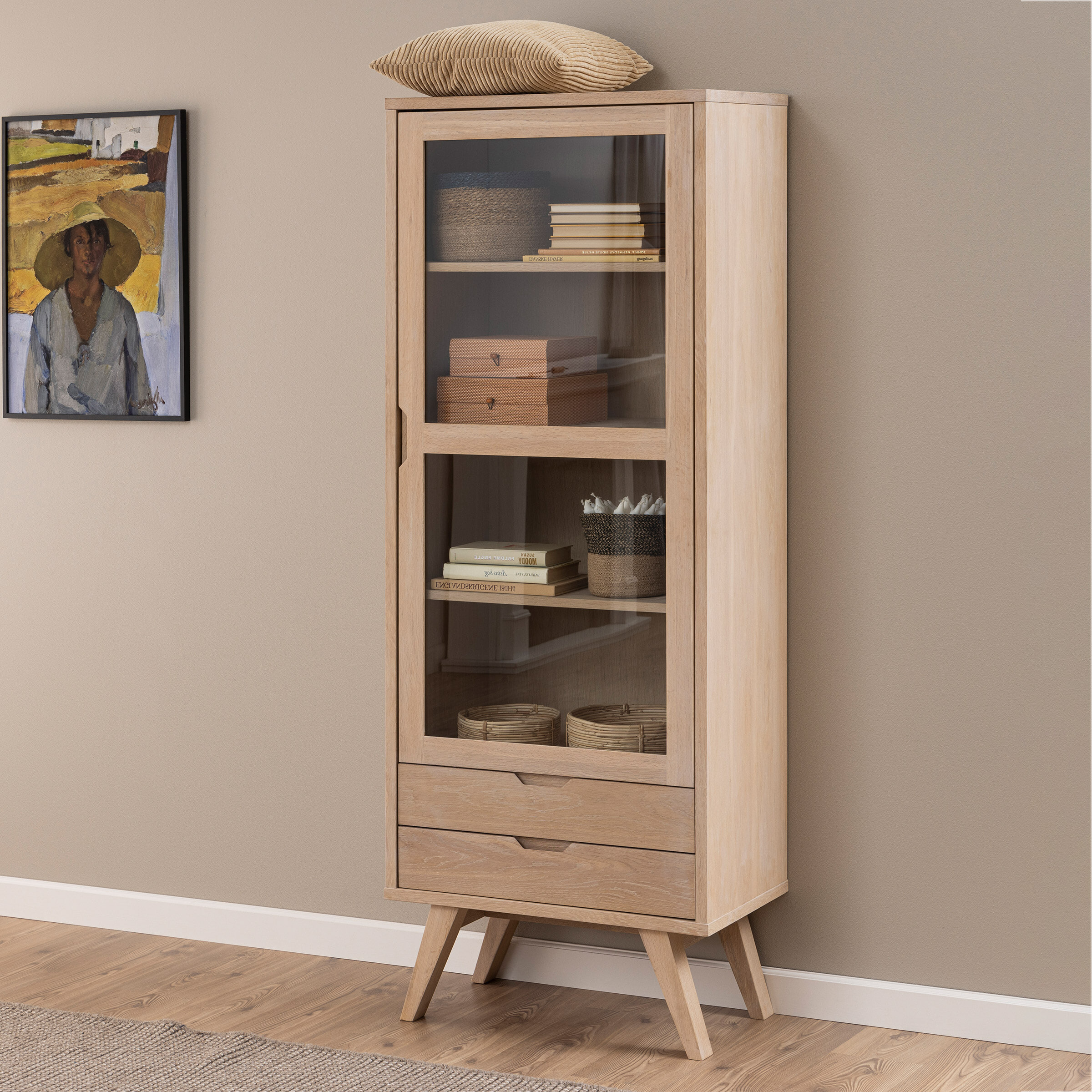 Deze vitrinekast is een moderne kijk op klassiek Scandinavisch design met een slank profiel voor een eigentijdse expressie. Met 2 lades en 3 verstelbare planken achter een transparante glazen deur kun je je schatten georganiseerd en beschermd tegen stof bewaren. Hij is uitgevoerd in wit gepigmenteerd geolied eikenhout en eikenfineer voor een strakke uitstraling.