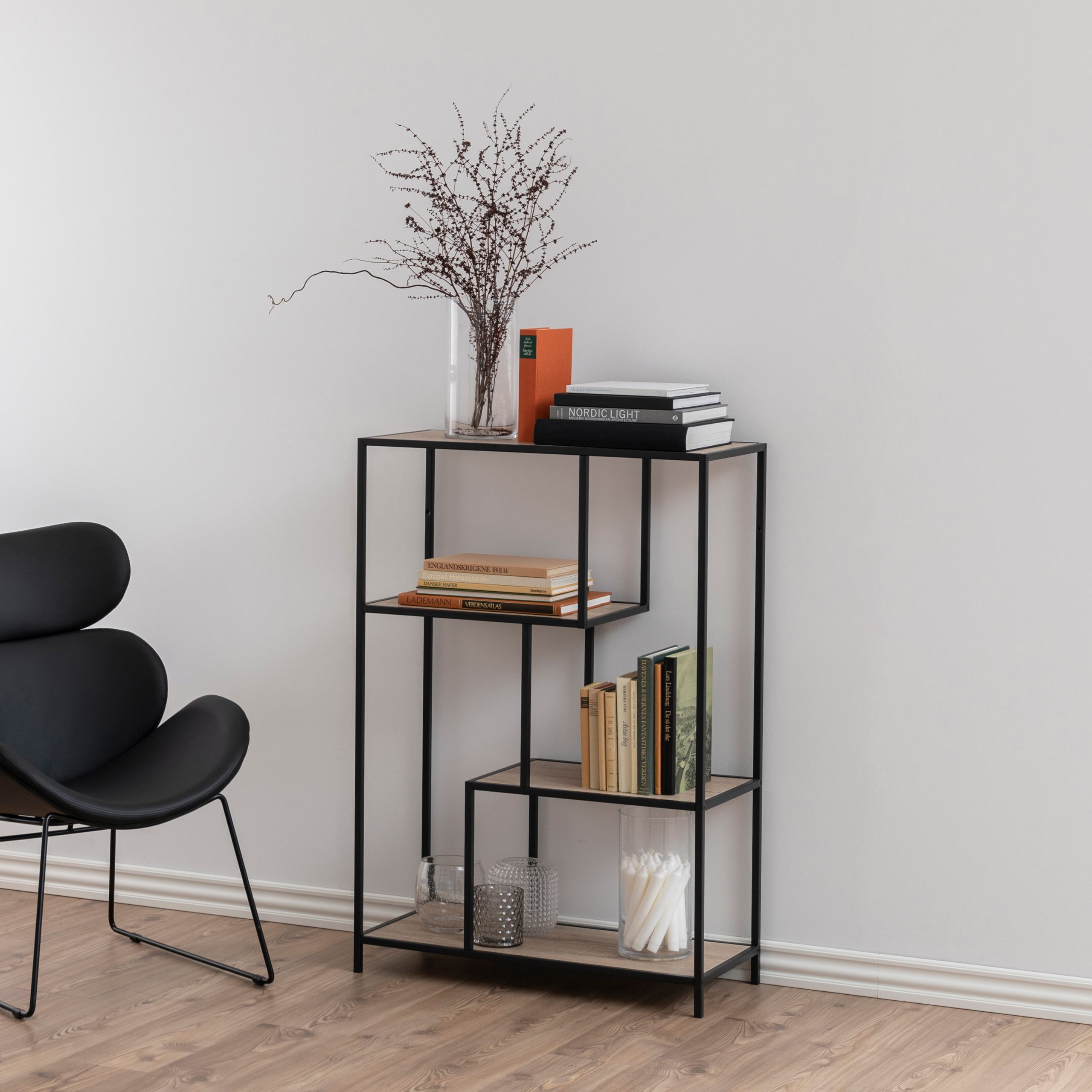 Maak een kamer af met stijl en veel opbergruimte. Maak optimaal gebruik van je ruimte met een veelzijdige boekenkast die de persoonlijkheid heeft om te passen bij vele stijlen van inrichting. Hij is perfect voor kantoor, keuken of woonkamer. De planken met wilde eiken look laten je je benodigdheden in stijl opbergen. Het zwart gepoedercoate metalen frame geeft de boekenkast een industriële uitstraling.