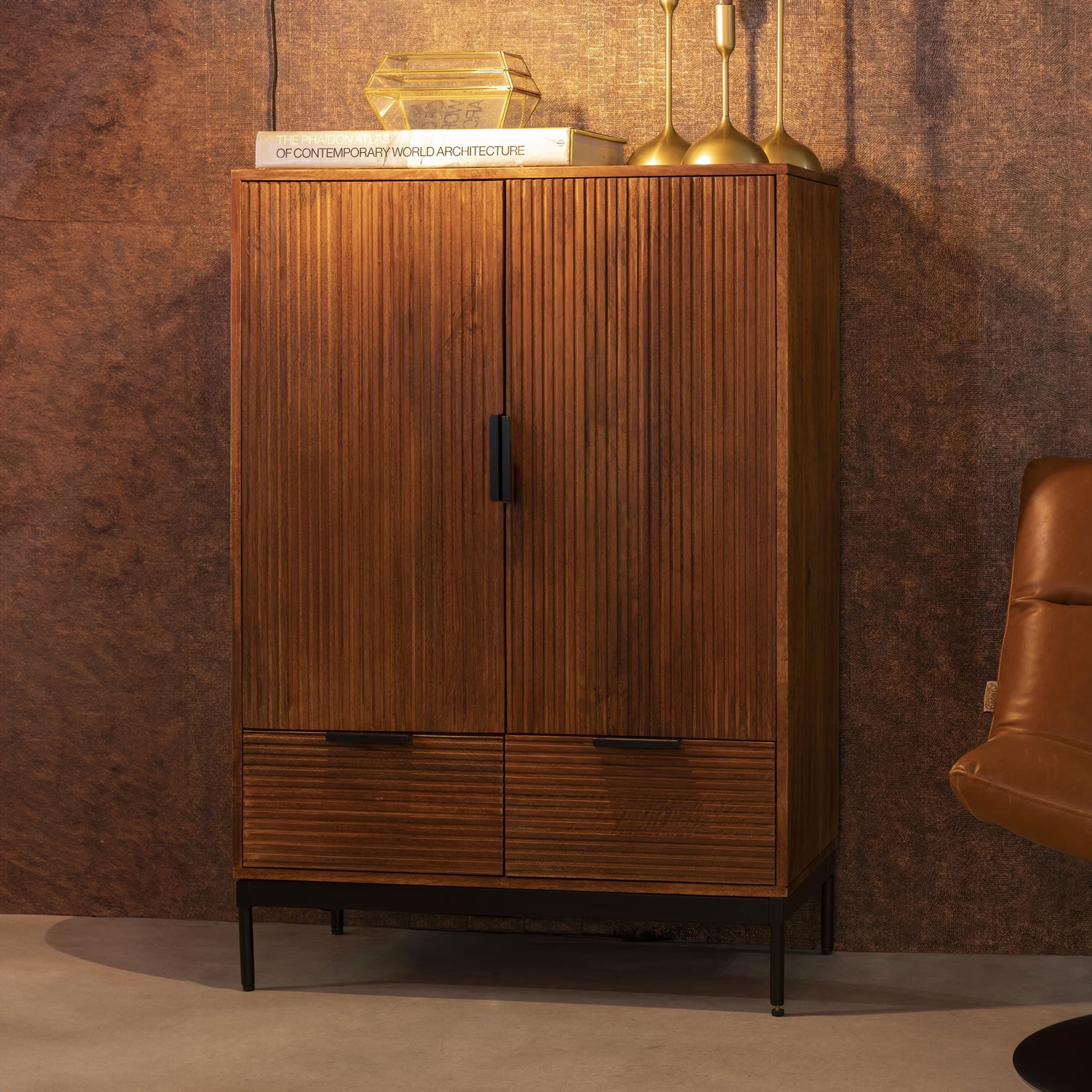 Retro meets modern met de Dutchbone Saroo serie. Deze meubels zijn gemaakt van massief mangohout, dat gefreesd is in een herkenbaar grafisch patroon. Dit zorgt voor een subtiele, vintage uitstraling. Toch passen de meubels ook perfect tussen de woontrends van nu, dankzij de moderne, matzwarte details. Kasten van pure kwaliteit dus, die de ruimte voorzien van een warme ambiance en waarin je je direct thuis voelt!