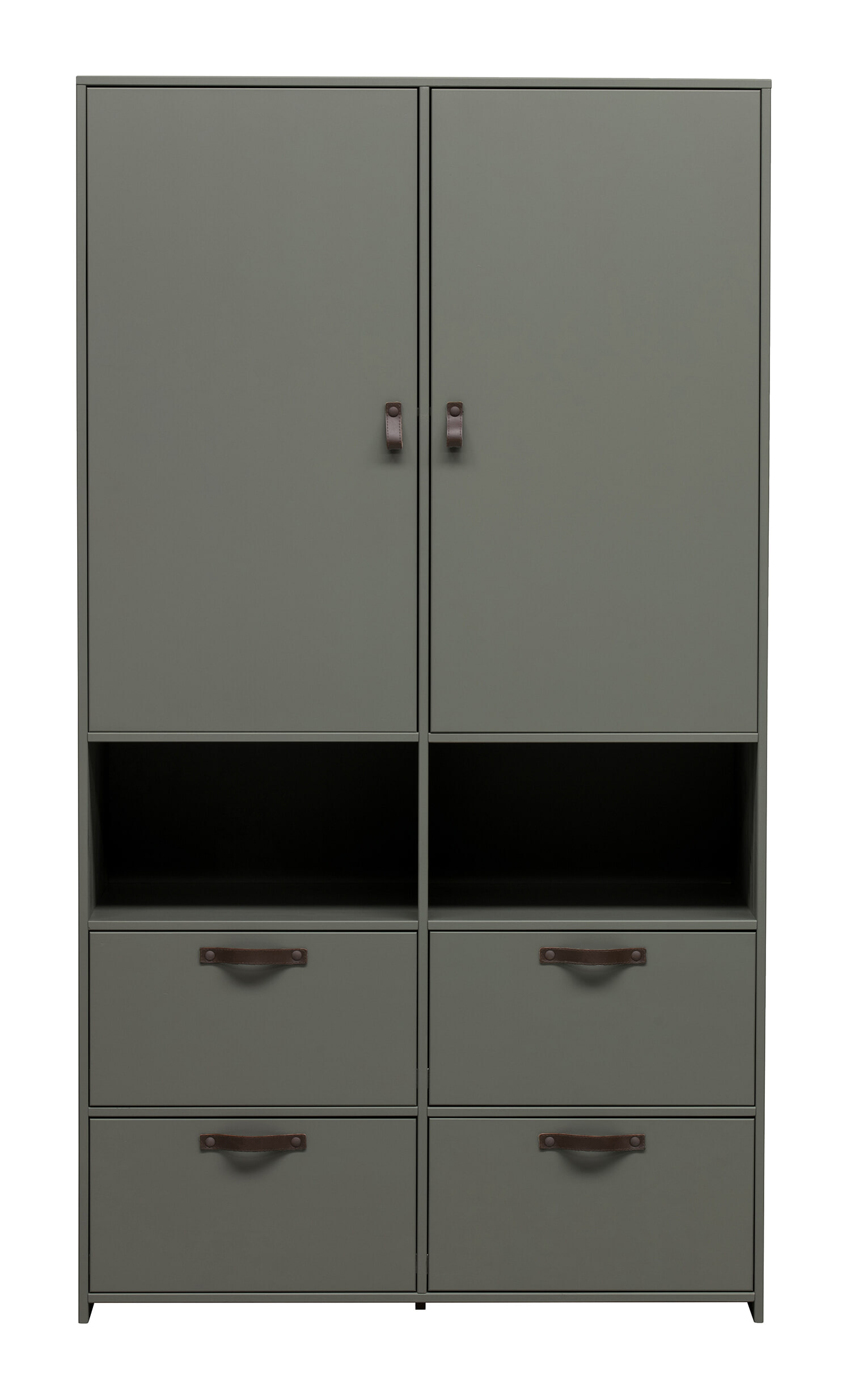 Deze Stage garderobekast uit de collectie van het Nederlandse merk vtwonen is modern en praktisch en heeft een stoere look. De kast is gemaakt van massief, FSC gecertificeerd, grenenhout gelakt in een groene soap tint en is voorzien van bruin leren greepjes. De twee open vakken ( H 26 cm) in de kast zorgen voor wat speelsheid.