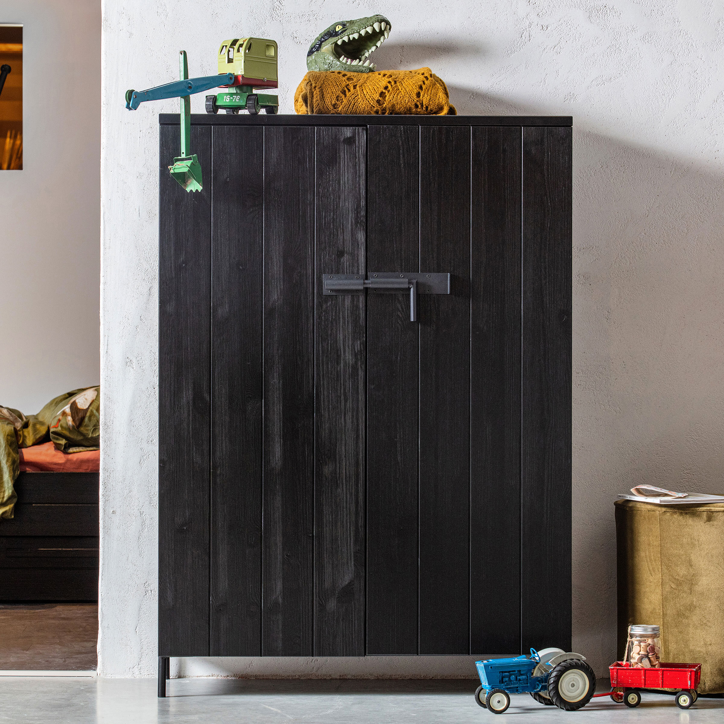 De Bruut 2-deurs kast uit de WOOOD collectie is een stoere opbergkast en een aanwinst voor elke ruimte. De kast is gemaakt van grenen hout dat een geborstelde afwerking heeft. De pootjes en de gave sluiting zijn gemaakt van metaal. Zowel het grenen hout als het metaal is afgewerkt in de kleur zwart.